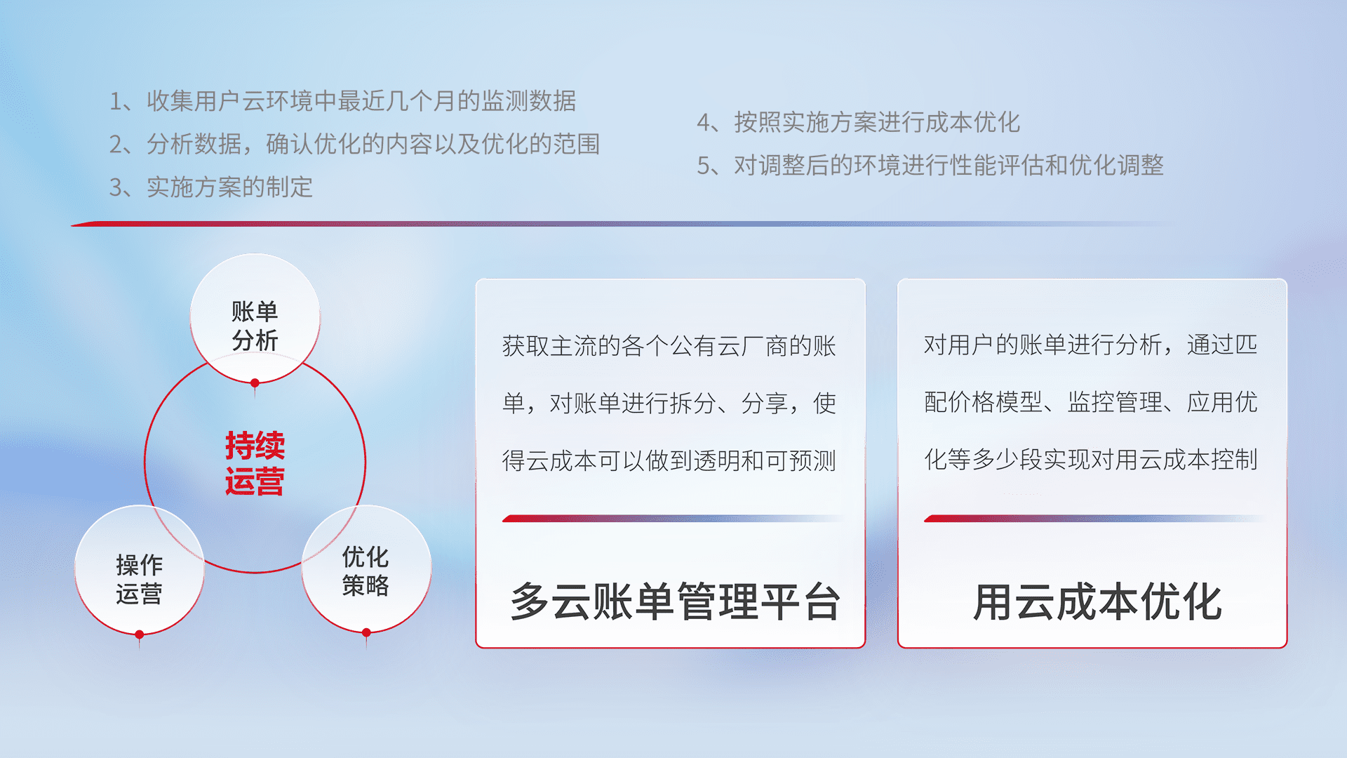 通过多云纳管,,以统一的资源数据模型把客户的云资源进行抽象和封装,,进而实现对多云资源的统一操作,,,,保障云资源管理的可靠性、、稳定性与可用性。。量身定制化运维内容,,,配置、、、开发运维、、补丁管理、、、、备份、、、、监控、、、、认证和访问管理、、、审计和日常巡检等,,,,保障在用云过程中的可靠度,,稳定度以及高可用率。。。