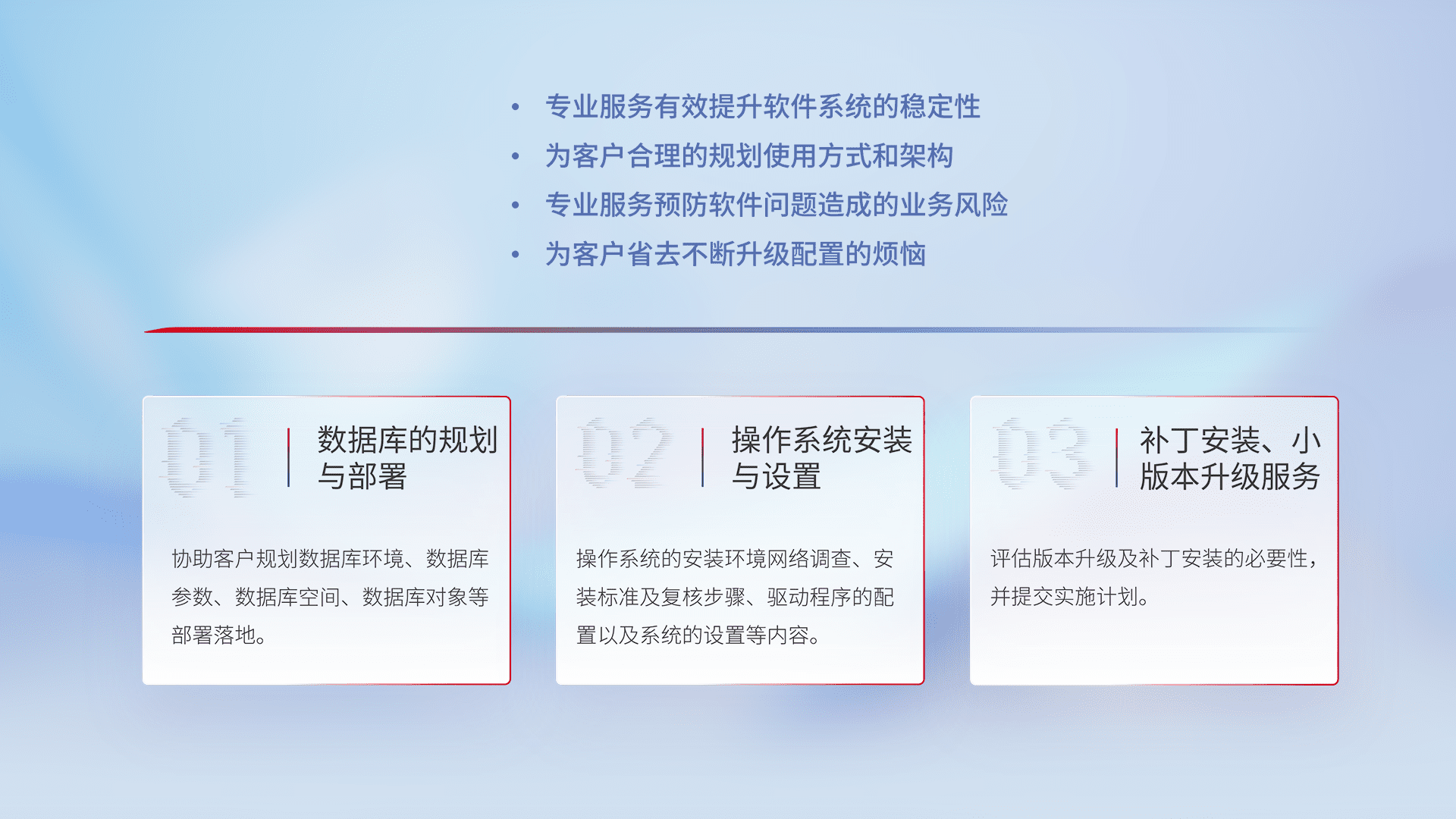 为客户提供软件规模升级、、快速部署、、、、按需配置的专业服务,,从数据库的规划与部署到操作系统的安装与设置,,,再到补丁安装和小版本升级提供支持。。。。